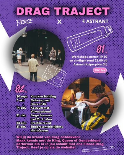 Komend najaar bieden we bij Fierce weer een traject van vijf dragworkshops aan, waarna je in drag eind oktober je opwachting zal maken tijdens HalloQueen op het grote podium! Daarbij stoomt Haus of 4D je klaar met een top-notch make-up look, Vulvaverbond komt langs om je te helpen met je kostuum en Mr. E. Man van House of FlocKing Birds zorgt dat jij een verpletterende indruk achterlaat met een workshop stageperformance.