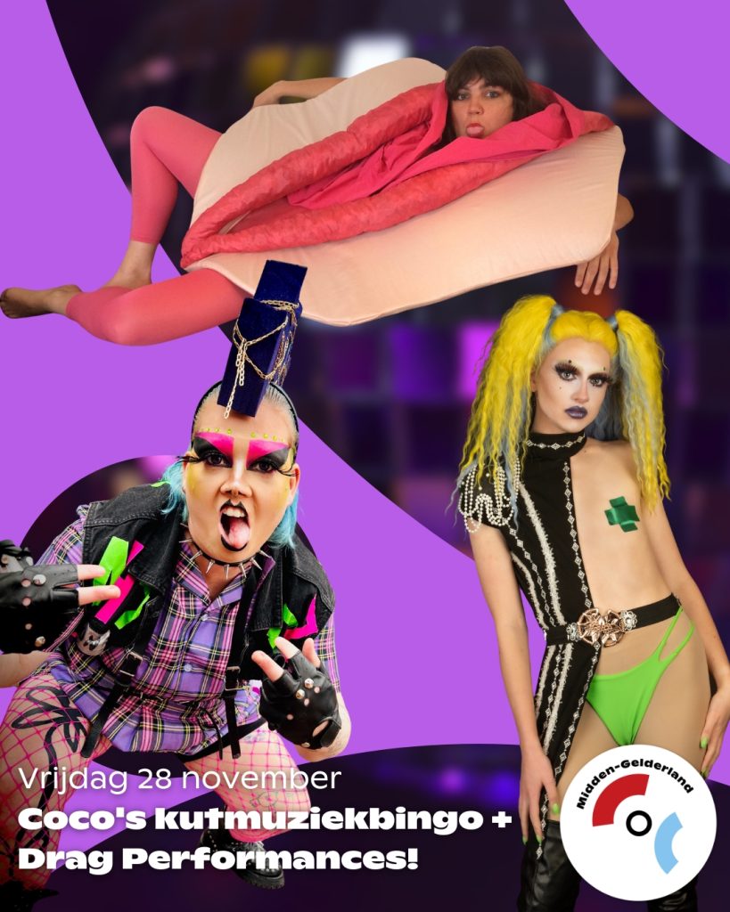 20.00 Coco’s Kutmuziekbingo met dragoptredens van Pixxie Colada, Sorcha Ten en Sunny Saltina en Rex Phoenix.
